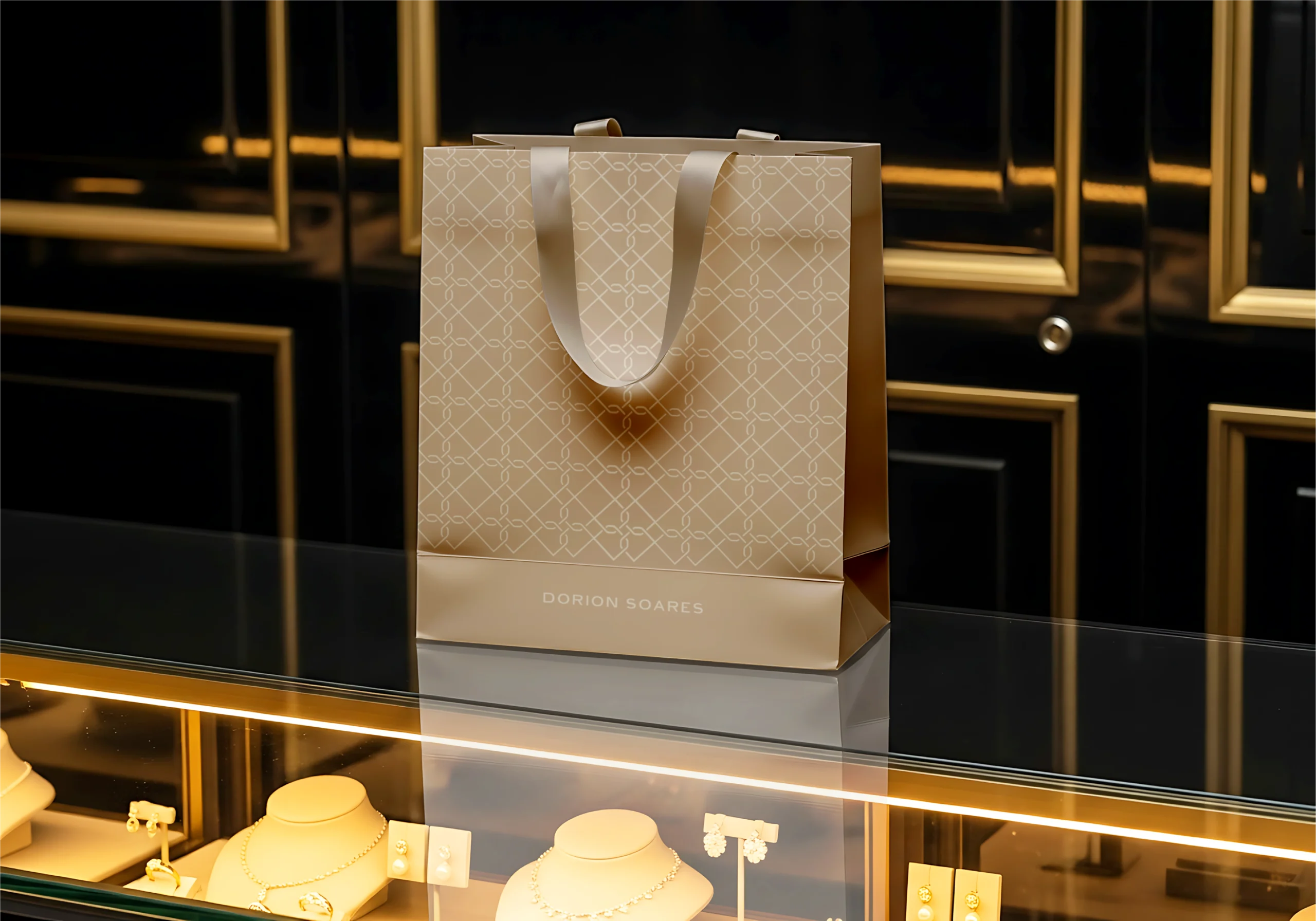 A marca Dorion Soares transmite refinamento, tradição e autenticidade. O redesenho do símbolo preserva sua essência e reforça a conexão com o mercado árabe por meio de arabescos elegantes, que comunicam sofisticação e herança cultural.